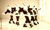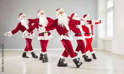 Happy New Year cute group dancing in studio, partying wearing Santa Claus holiday costume, Merry Christmas red suits, celebrating festive season, gathered together enjoying lively and joyful party