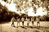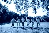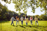 Back view of a group of happy friends walking in a row holding hands outdoors. Six young men and women wearing casual clothes spending time together. People walking in the park on a summer day.