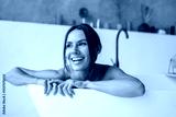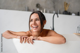 Smiling lady taking relaxing bath looking aside away. Sitting in bathtub with foam in modern bathroom at home. Woman bathing enjoying bodycare routine. Beauty and spa concept