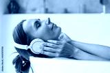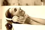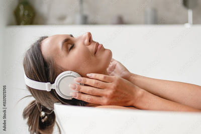 Close up portrait of brunette Caucasian lady taking bath full of foam and listening to music with closed eyes, using wireless headset, enjoying weekend alone at home, side view