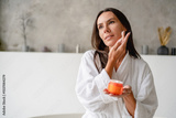 Skincare Concept. Cheerful brunette woman holding cream moisturizer caring jar for skin sitting in modern bathroom at home. Female beauty rituals, skin care cosmetic products concept