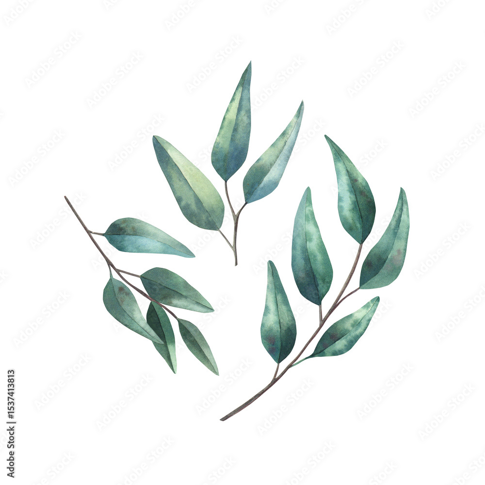 Watercolor hand drawn illustration. Little set of eucalyptus branches with green leaves. Botanical isolated elements on a white background for design, invitational and greeting cards, prints.