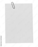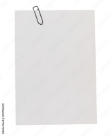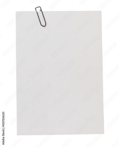 Empty note paper mockup with black paper clip. Message reminder A6 card template isolated on transparent background. White paper texture. Business office stationery object. Writing, notes, school