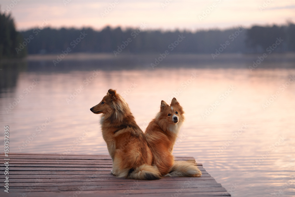 Two Collies sitting on a dock near the calm waters of a lake during sunset. The peaceful environment captures the bond between the dogs.