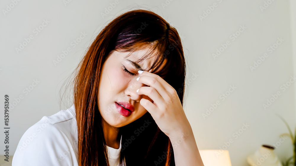 Young asian female having depression sitting alone in bedroom corner. woman headache unhappy emotion. young anxiety despairing mental health problems, Migraines, lack of sleep and depression