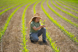 Child planting. Kid caring for the corn. Young farmer in eco-friendly corn field. Farming in green ecosystem. Eco farming. Rural child. Corn in soil. Organic farming with kids. Growing corn.