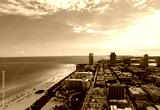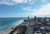 Miami Beach skyline aerial view. Miami city from drone. Tropical Miami scene. Miami district sky view. Famous oceanfront. Panoramic coastline. South beach panorama view. Summer holiday vibes.