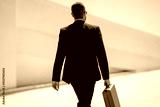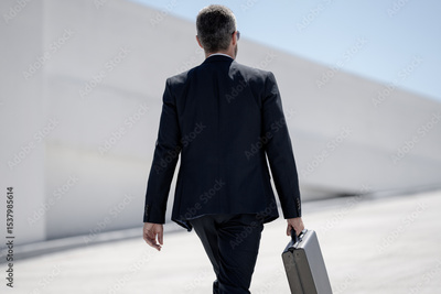 Businessman back walking outdoors. Successful businessman with briefcase in suit. Confident business man back in suit. Business man walking away. Rich man in suit. Urban business man with briefcase.