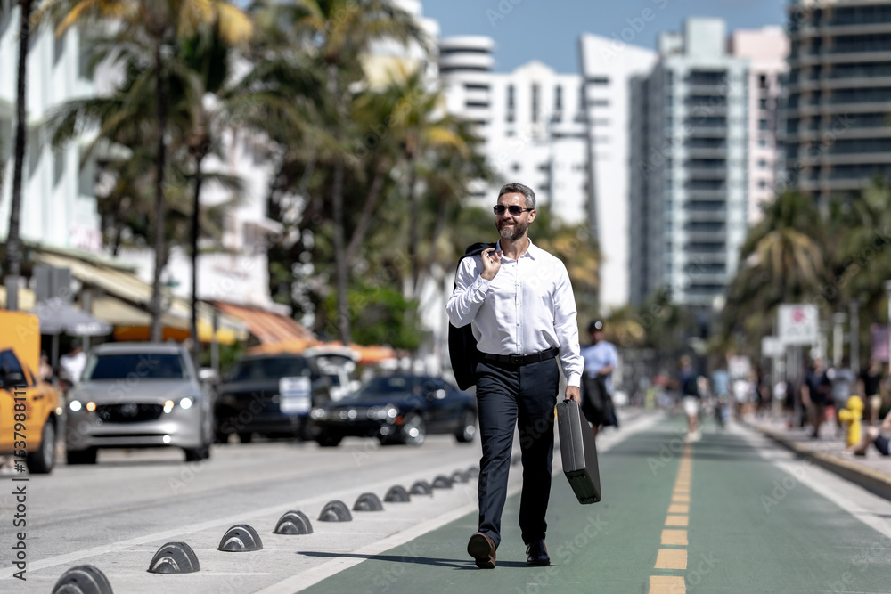 Mature businessman walking confidently in the city. Business man walking down the street. Handsome businessman walking on way to the office. Confident entrepreneur walking outdoors.