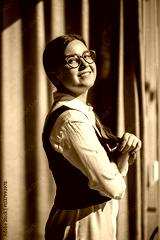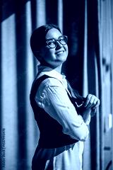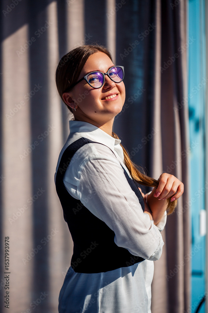A confident young woman poses joyfully for a photograph, displaying a warm smile in stylish attire with fashionable glasses, set against a bright, vivid backdrop that radiates positivity