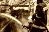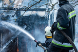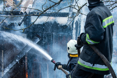Firefighter put out a fire. Brave firefighter battling house blaze. Firemen in uniform near burning home. Firefighter uses hose to control fire. Firefighting concept. Firefighter in helmet on flame.
