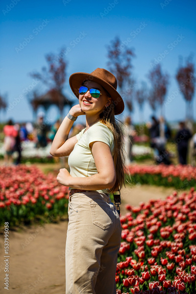 A Joyful Young Woman Dressed in a Breezy Summer Outfit Enjoys the Beautiful Scenery of Vibrant Tulip Fields Under a Bright Sunny Sky on a Delightful Day of Exploration and Relaxation