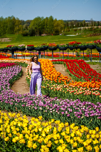 A woman gracefully strolling through a vibrant and colorful tulip field that is in full bloom, all set against the backdrop of a clear blue sky, creating a picturesque scene of beauty and peace