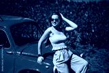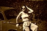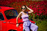 A young woman is elegantly posing beside a stunning vintage red car, surrounded by vibrant and colorful tulip fields, creating a picturesque and cheerful scene full of beauty and joy