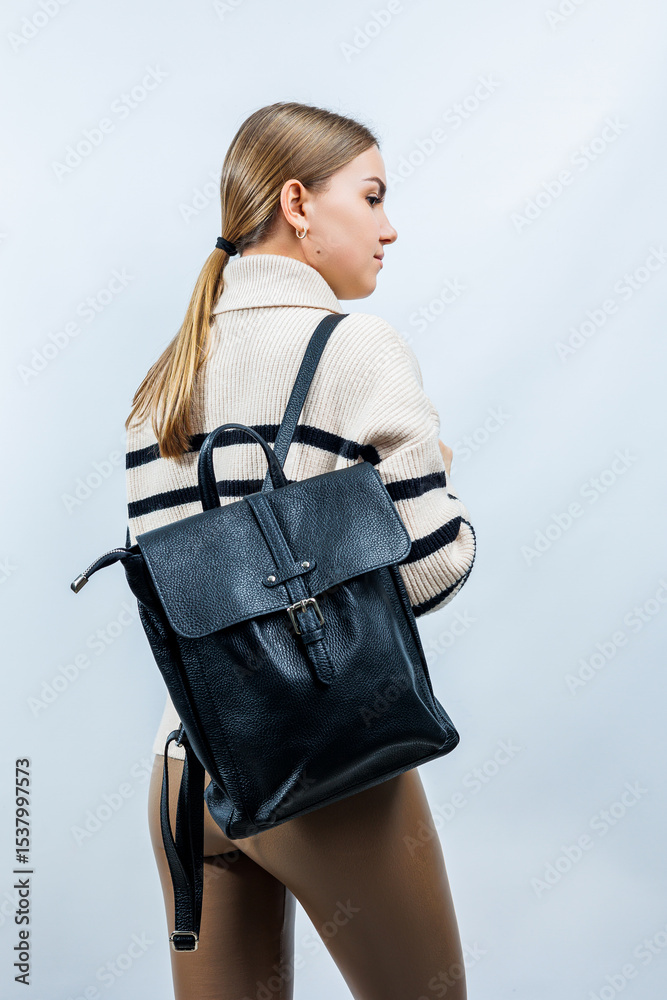 A fashionable woman poses confidently with a sleek, modern black backpack set against a light and airy background, highlighting this trendy accessory perfect for everyday use in various situations