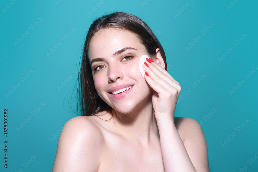 Beautiful young woman with cotton pad, applying lotion on face, removing makeup. Skin care. Studio portrait of girl cleaning her face with cotton pad, isolated background. Face toner and cotton pad.