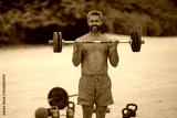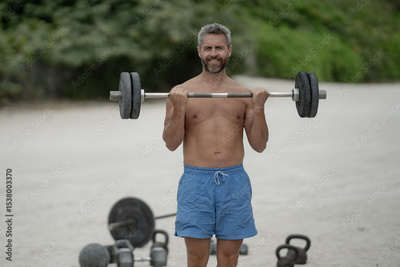 Fit man lifting barbell outdoor. Weight training with barbell in public park. Strong arms and shoulders lifting barbell. Sport model doing barbell. Athletic lifestyle with outdoor barbells exercises.