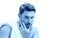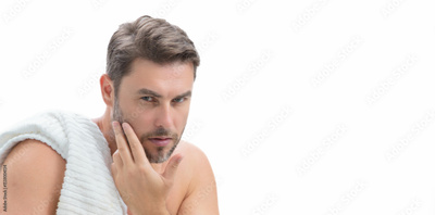 Banner of man with perfect skin touch face after shaving. Skin care healthcare cosmetic procedures concept. Close up man looking in mirror, sensitive skin, cosmetology treatment. Skin care.