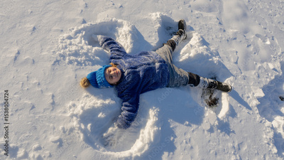 Child making a snow angel. Happy kid lying in the snow. Kid angel in snow. Winter kids with snowy angel wings. Smiling child on a snowy day. Carefree kid in the snow lake angel. Marry Christmas.