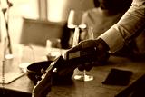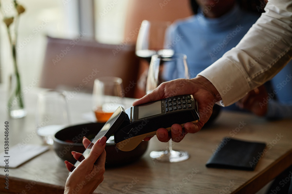 Male restaurant worker holding payment terminal while woman making contactless payment with smartphone at table, wine glasses visible