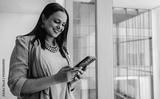 Indian businesswoman smiling while using her smartphone in a modern office environment