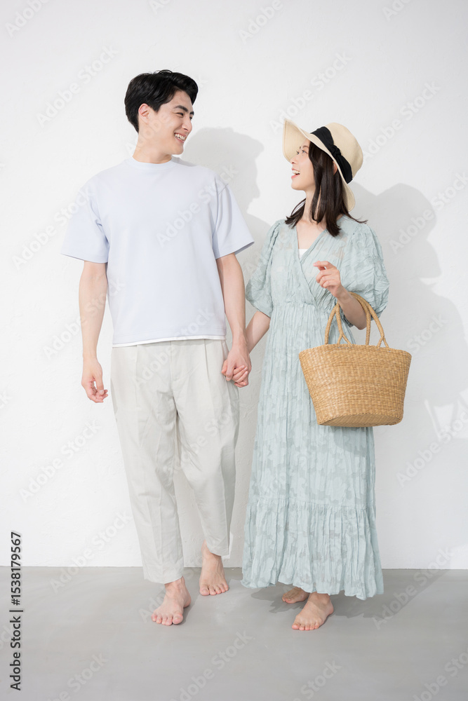 夏のカップルでお出かけやレジャーやリゾート旅行、新婚旅行や夏休みのイメージの全身手を繋ぐ 白背景