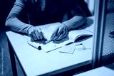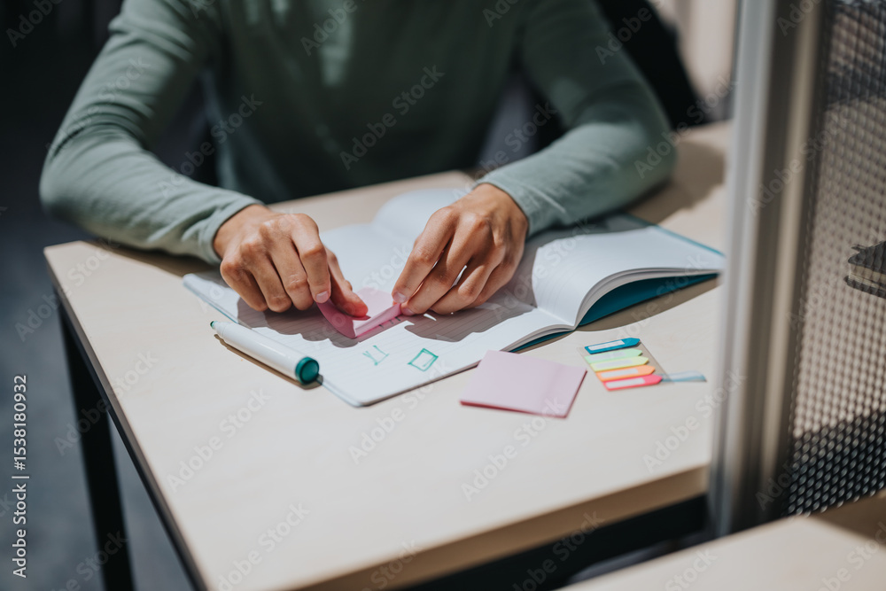 A high school student organizes study notes using colorful sticky notes in a classroom setting. The scene depicts an educational atmosphere focused on creativity and effective learning strategies.