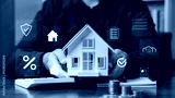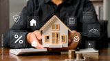 Real estate concept business, home insurance and real estate protection. Real estate investment concept. Buy and sell houses and real estate online on a virtual screen.