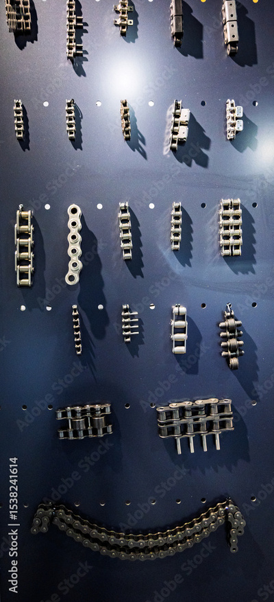 Various metal chains, including roller, block, and silent types, displayed vertically on a dark blue board. Showcasing industrial mechanical transmission components and engineering technology.