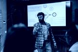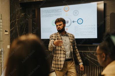 A business professional delivers a presentation in a corporate setting, emphasizing important data insights. The late night session highlights dedication and teamwork in achieving company goals.