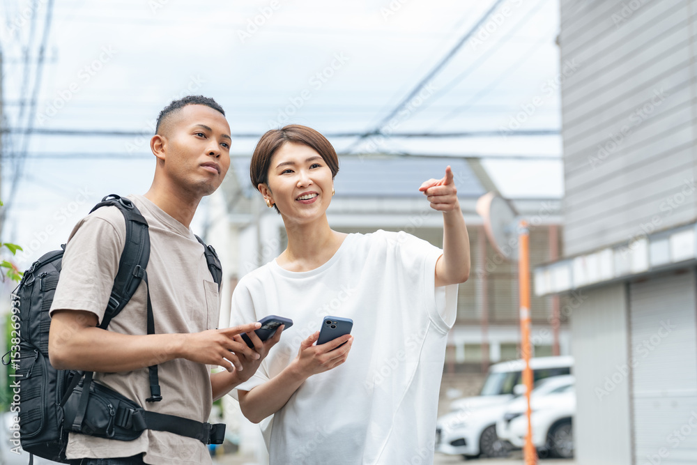 スマホを持って黒人男性に道案内する日本人女性