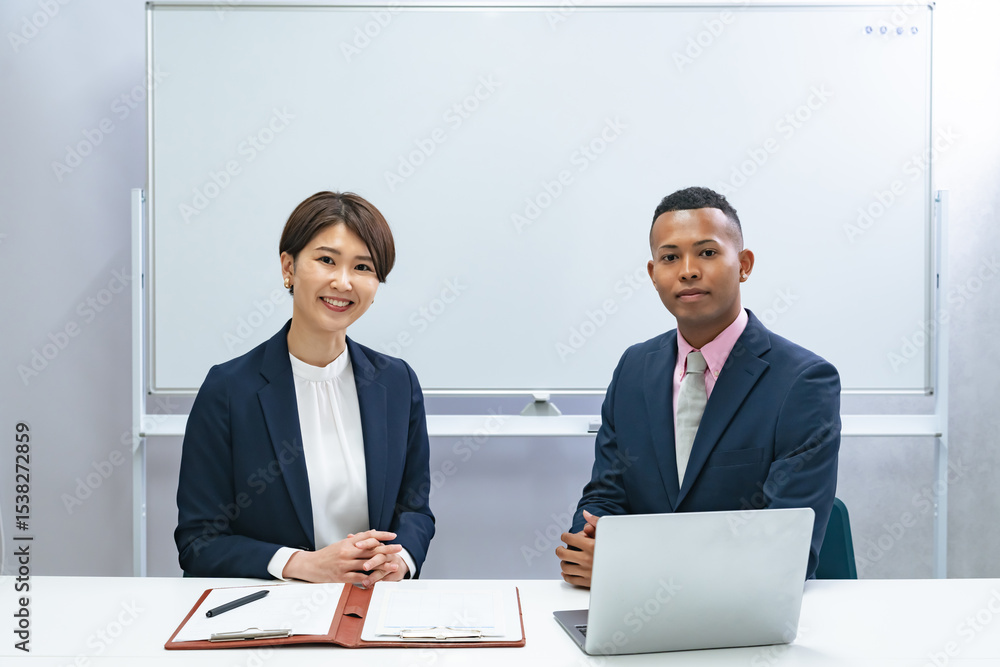 ホワイトボードの前に並んで座る黒人男性ビジネスマンと日本人女性スタッフ