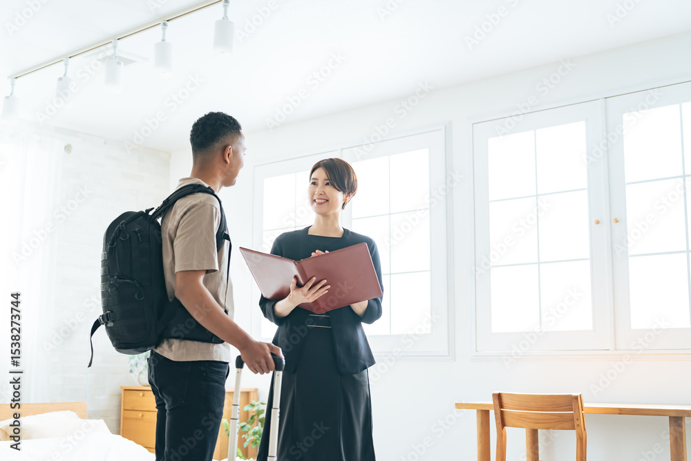 黒人男性旅行客に部屋を案内する女性ホテルスタッフ