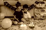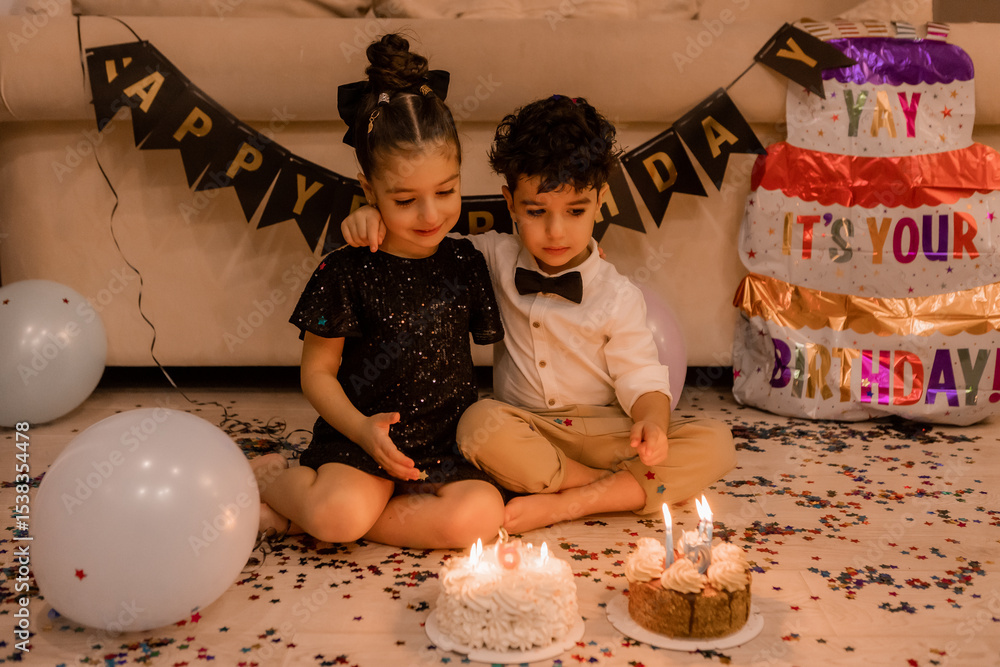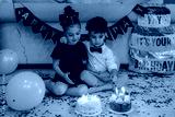 Two twin children, a boy and a girl, blow out candles on a birthday cake
