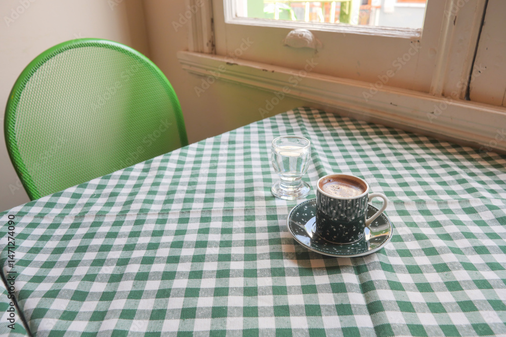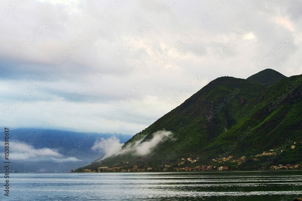 Fog rolling over mountain peaks with lush green vegetation in sea bay fjord