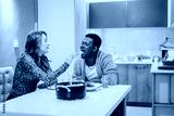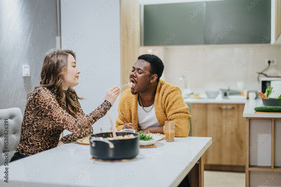 A warm moment between a couple enjoying a shared meal in a beautifully designed modern kitchen, fostering love and camaraderie during their mealtime