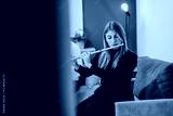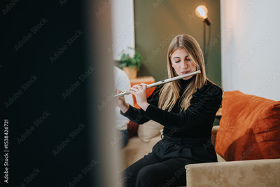 A female musician practices playing the flute while seated on a cozy sofa indoors. Artistic atmosphere with elegant modern decor seen in the background.