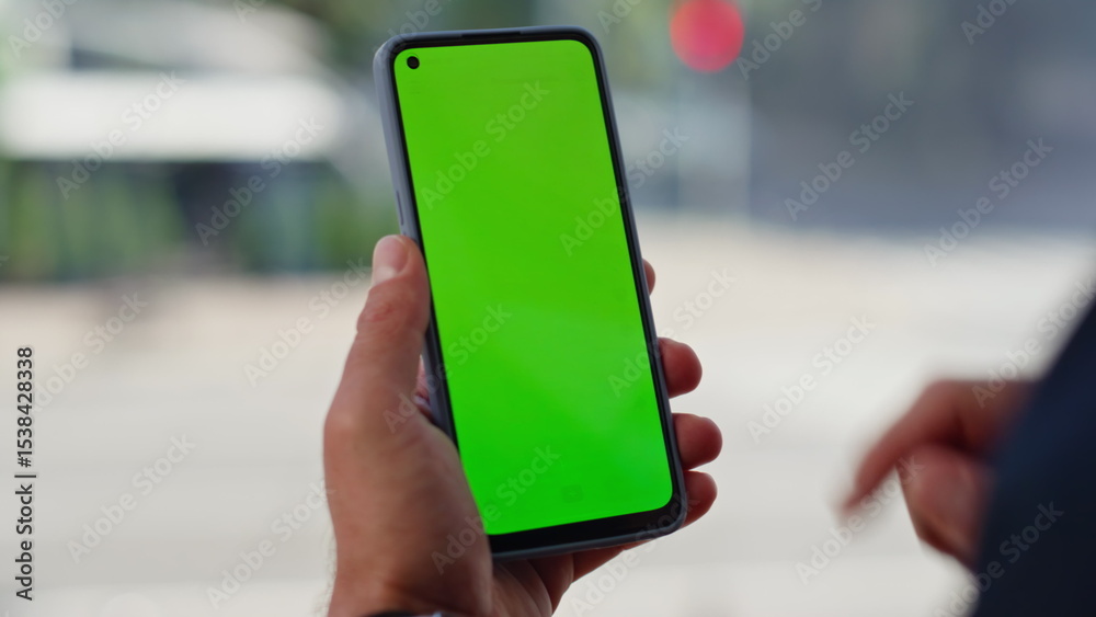 Hand tapping smartphone green screen browsing online in city view place closeup