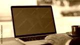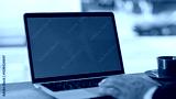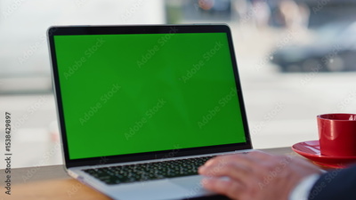 Businessman fingers scrolling mockup laptop touchpad working at cafe closeup