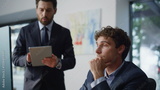 Office mentor learning intern at desk with computer closeup. Business meeting