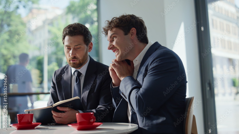 Two startupers working remotely at coffee house closeup. Active manager calling