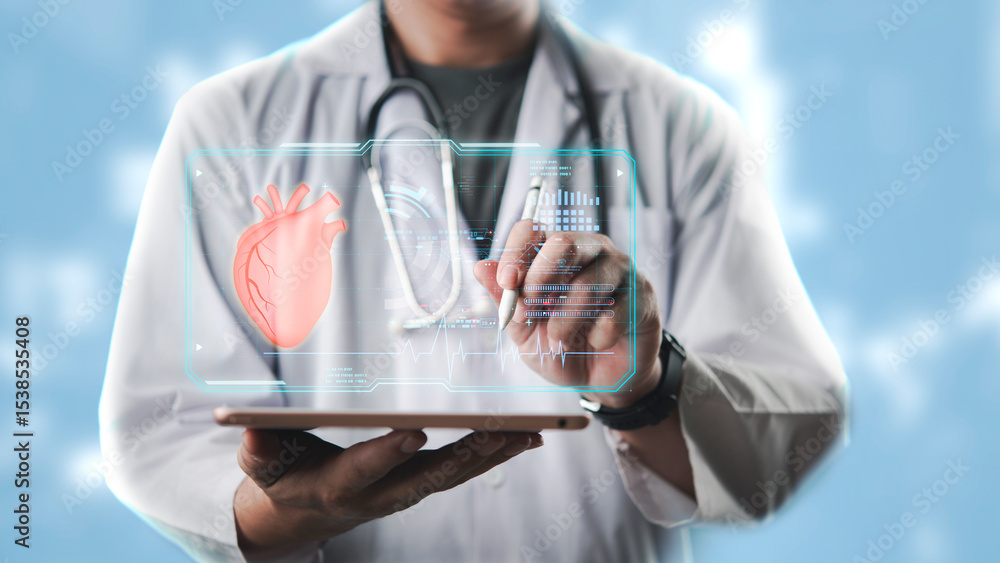 Modern healthcare concept with doctor controlling virtual ECG and heart data on futuristic for AI artificial intelligence diagnosis and treatment, telemedicine and innovative hospital solutions.