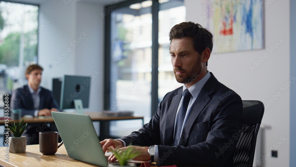 Focused employee texting laptop keyboard at coworking closeup. Man rejoicing