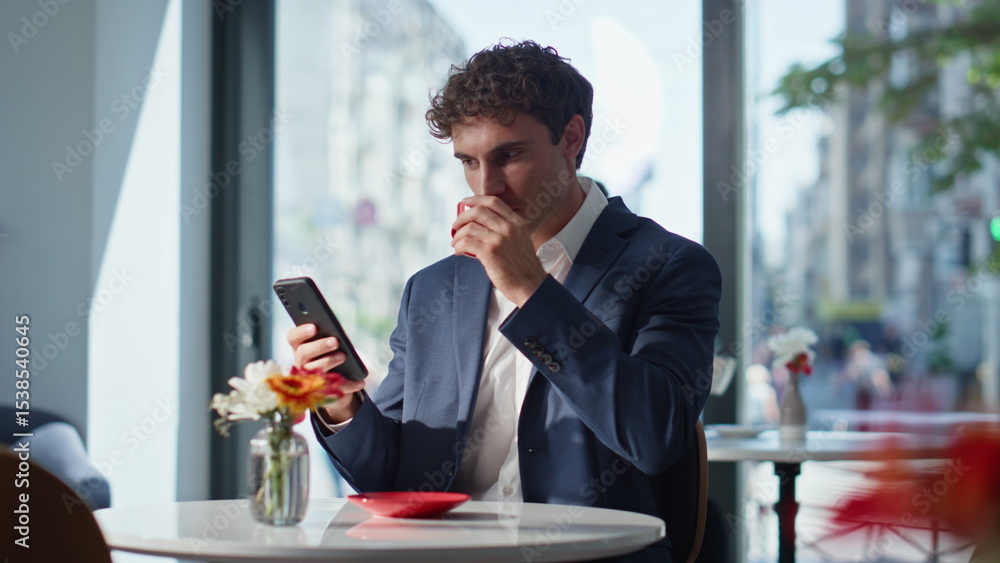 Relaxed ceo enjoying espresso sitting office canteen closeup. Resting colleagues