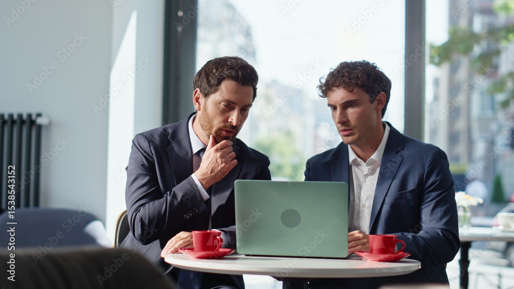 Professional business colleagues brainstorming looking laptop at cafe closeup