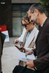 Two individuals discussing and analyzing documents. The outdoor setting and their attire emphasize a professional environment, fostering concepts of teamwork, communication, and collaboration.