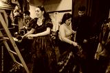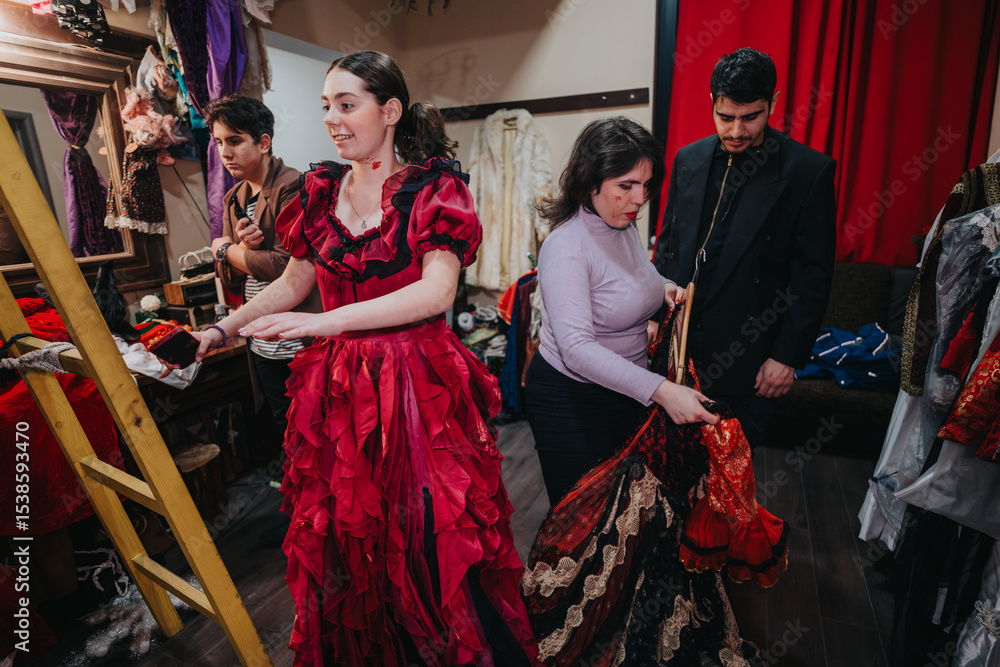 A group of young actors gather in a colorful dressing room, selecting costumes and preparing for their upcoming theatrical performance. The image captures a lively and creative backstage environment.