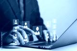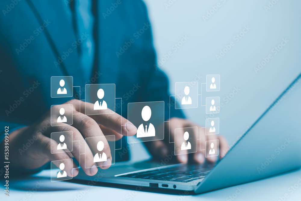Businessman showing concept of human resources, employees, employment, management, training, HR, technology, business leadership concept, consulting, customer concept, digital service.