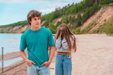 A young couple quarreling on the beach, the guy in the foreground and the upset girl crying behind him