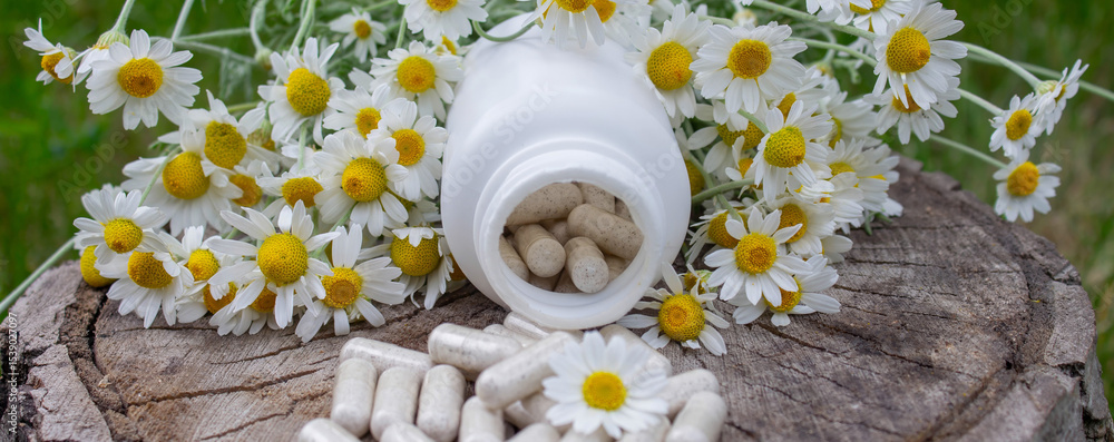 Chamomile Capsules and Fresh Daisies on Wooden Surface